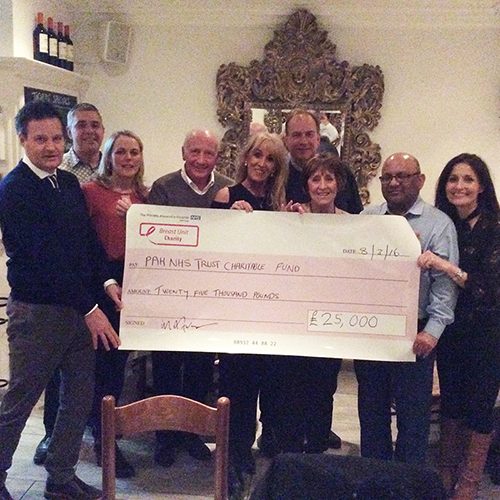 In February we presented a cheque for £25,000 towards breast cancer clinical trials run by Ashraf Patel and Ruth McCrae at The Princess Alexandra Hospital NHS Trust. This amount represents a year of fundraising by our incredible supporters – running, golfing, selling, and auctioning. The clinical trials are run on charitable funds, so the money raised is vital to help discover new drug treatments.